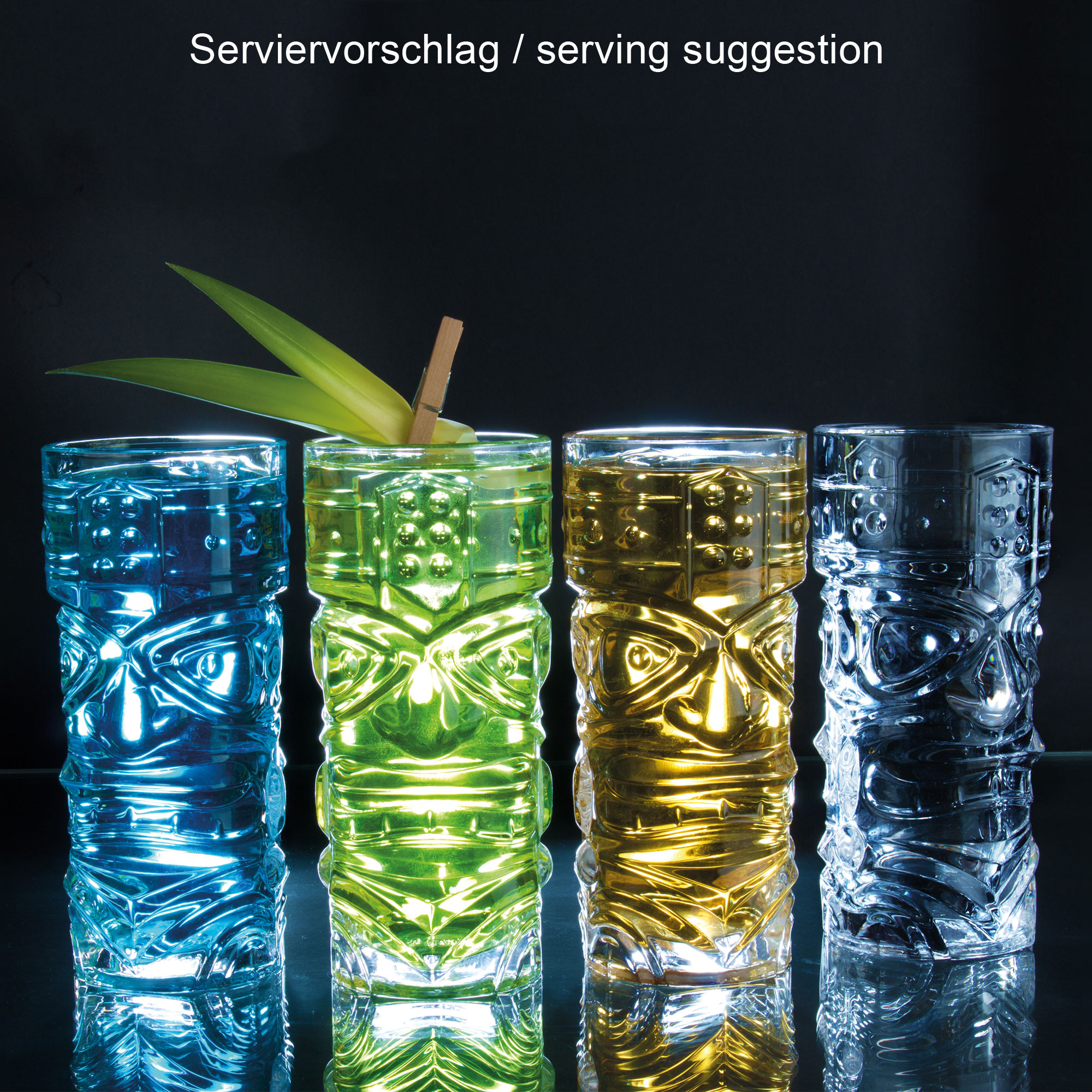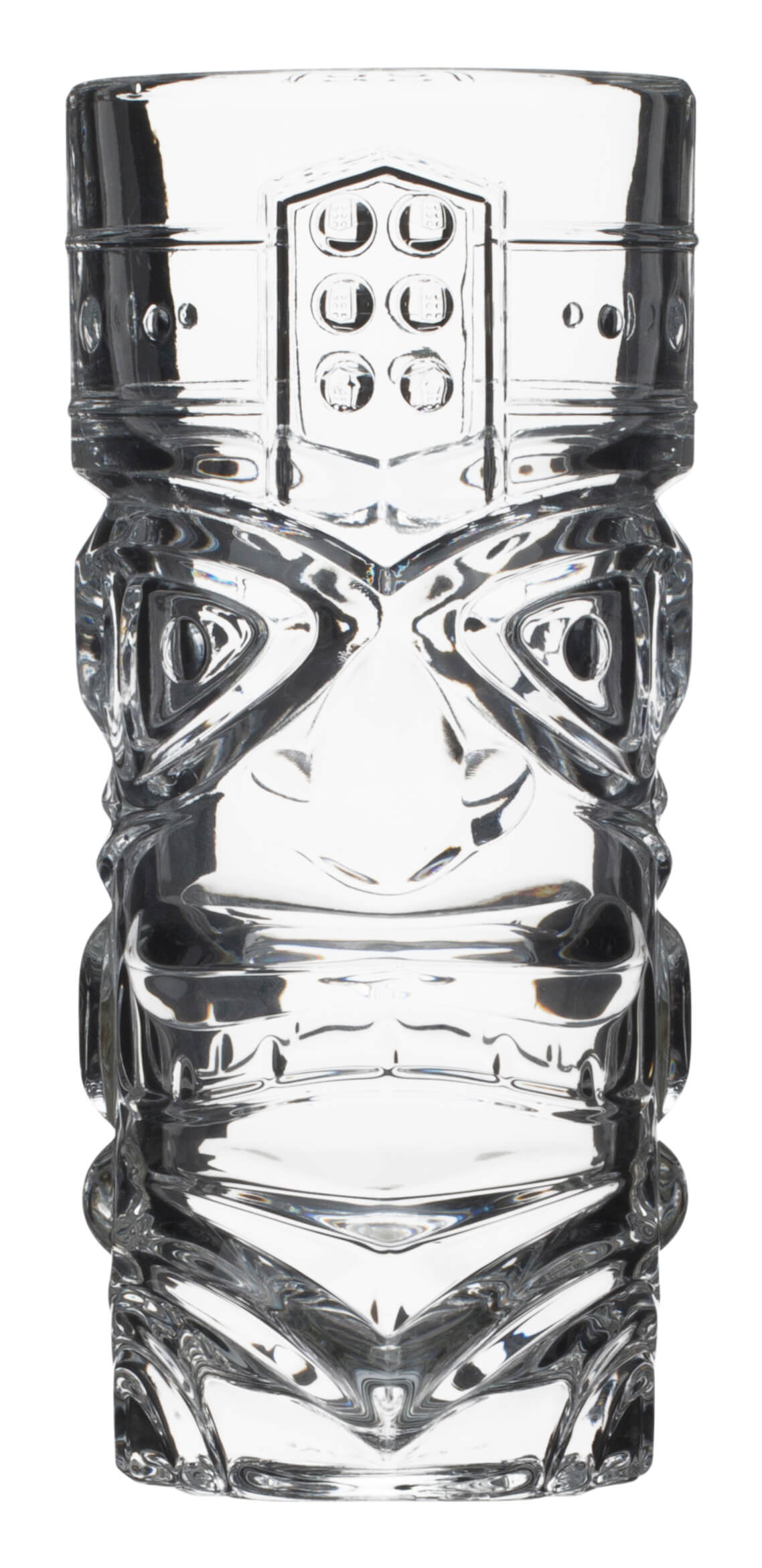 This one with 430ml volume does the same: a crowned tiki god with furious eyes and a big nose. But it is made of glass instead and so will not hide the sometimes colourful sensation of tiki cocktails.