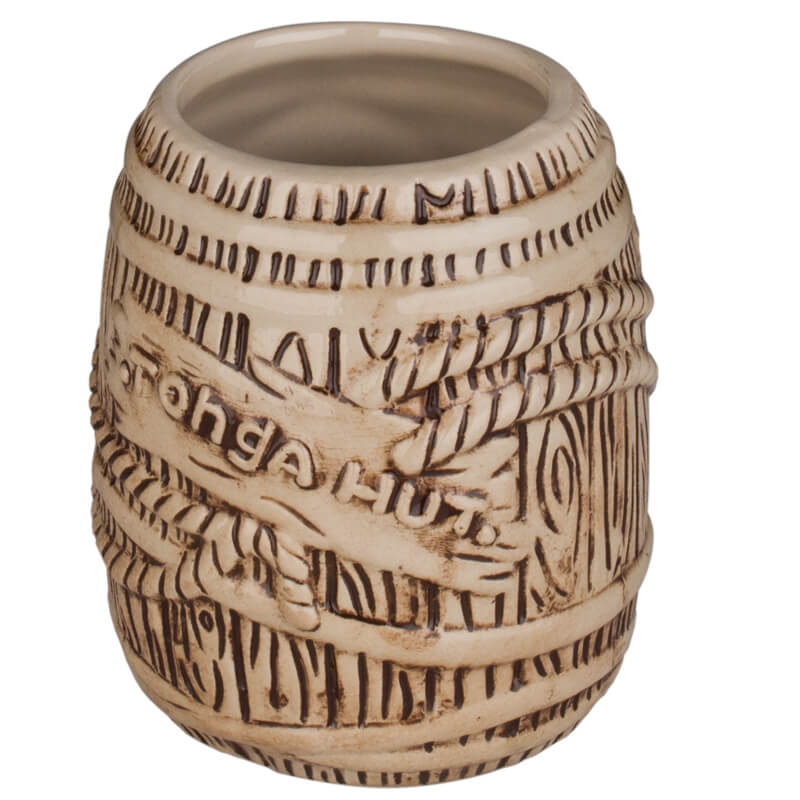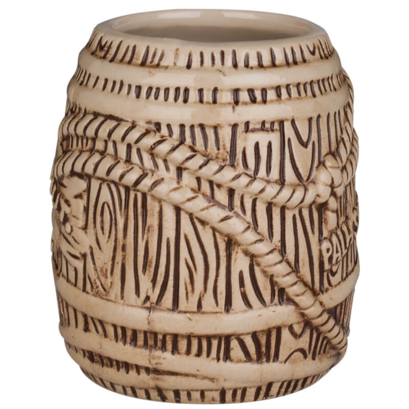 This round Tiki mug is modeled after a wooden barrel, whereby the three-dimensional structure of the depicted wood, ropes and lettering are also tactile and make for an interesting feel when holding the cup. The texts on the cup are modified digs at US Tiki culture: PALH-SPRINGS.ca is a fake domain and stands for the city Palm Springs in California; the Tonga Hut is the oldest Tiki bar in Los Angeles!