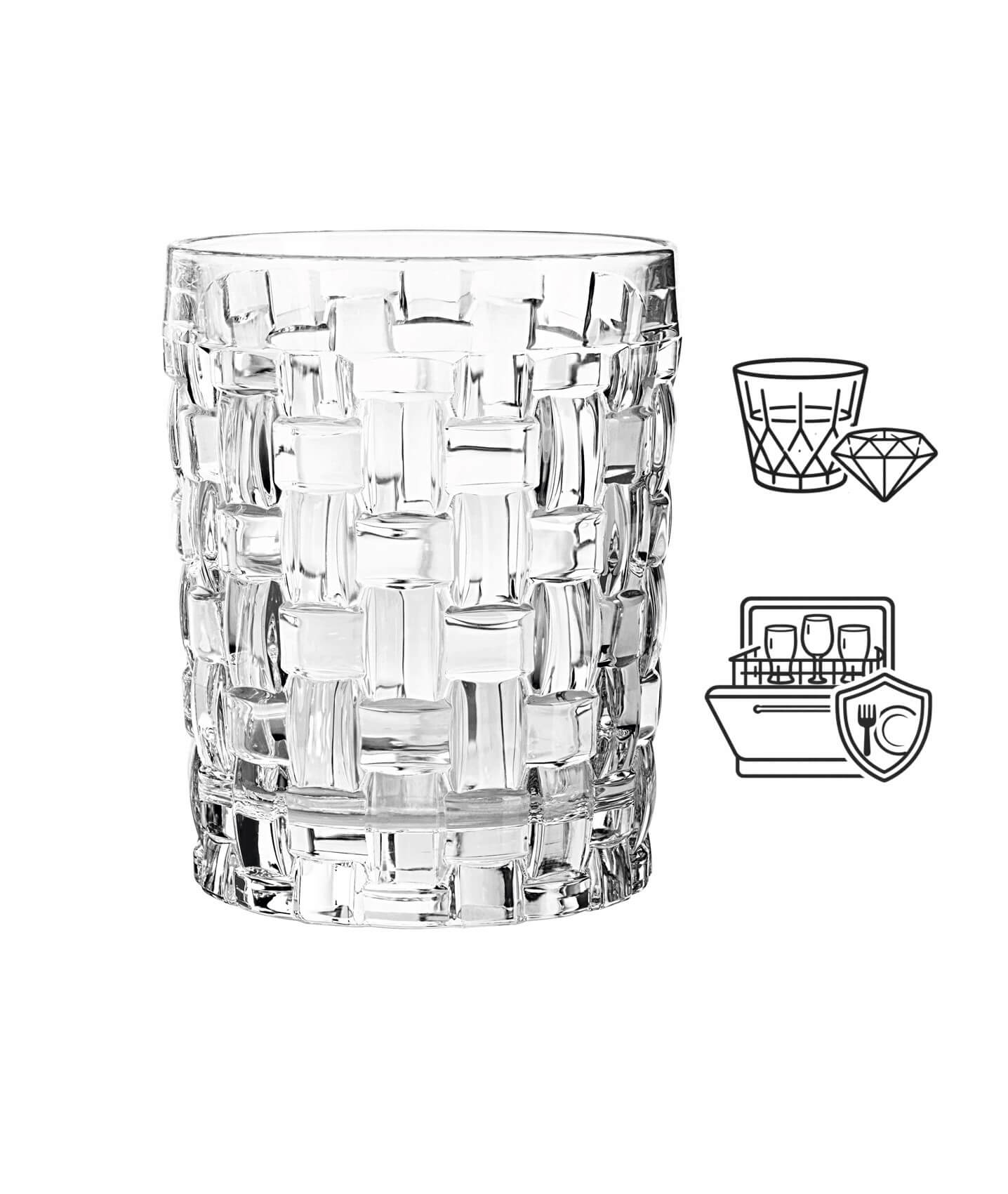 The glasses from the series 'Bossa Nova' by Nachtmann are based on the movement of the 1960s. They have the classical shape of a tumbler glass combined with a multifaceted woven design. The glass has a solid base and a fine cut design.