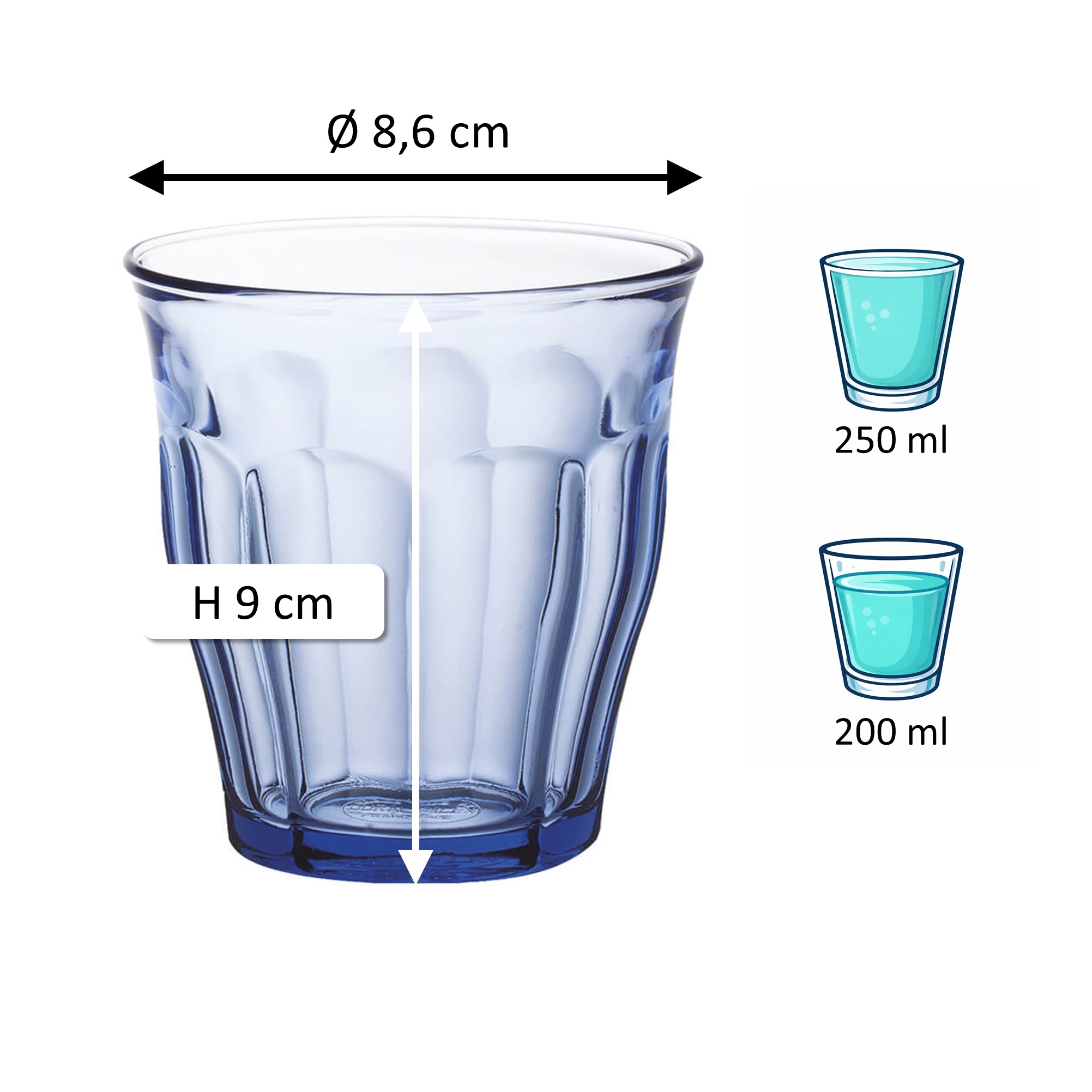 The blue tumbler from the Picardie series by Duralex has a volume of 250ml and is suitable for a variety of drinks. The blue tumblers are solid-colored so that the color does not wear off in the dishwasher or during daily use. The glass is also tempered, making it particularly resistant.
