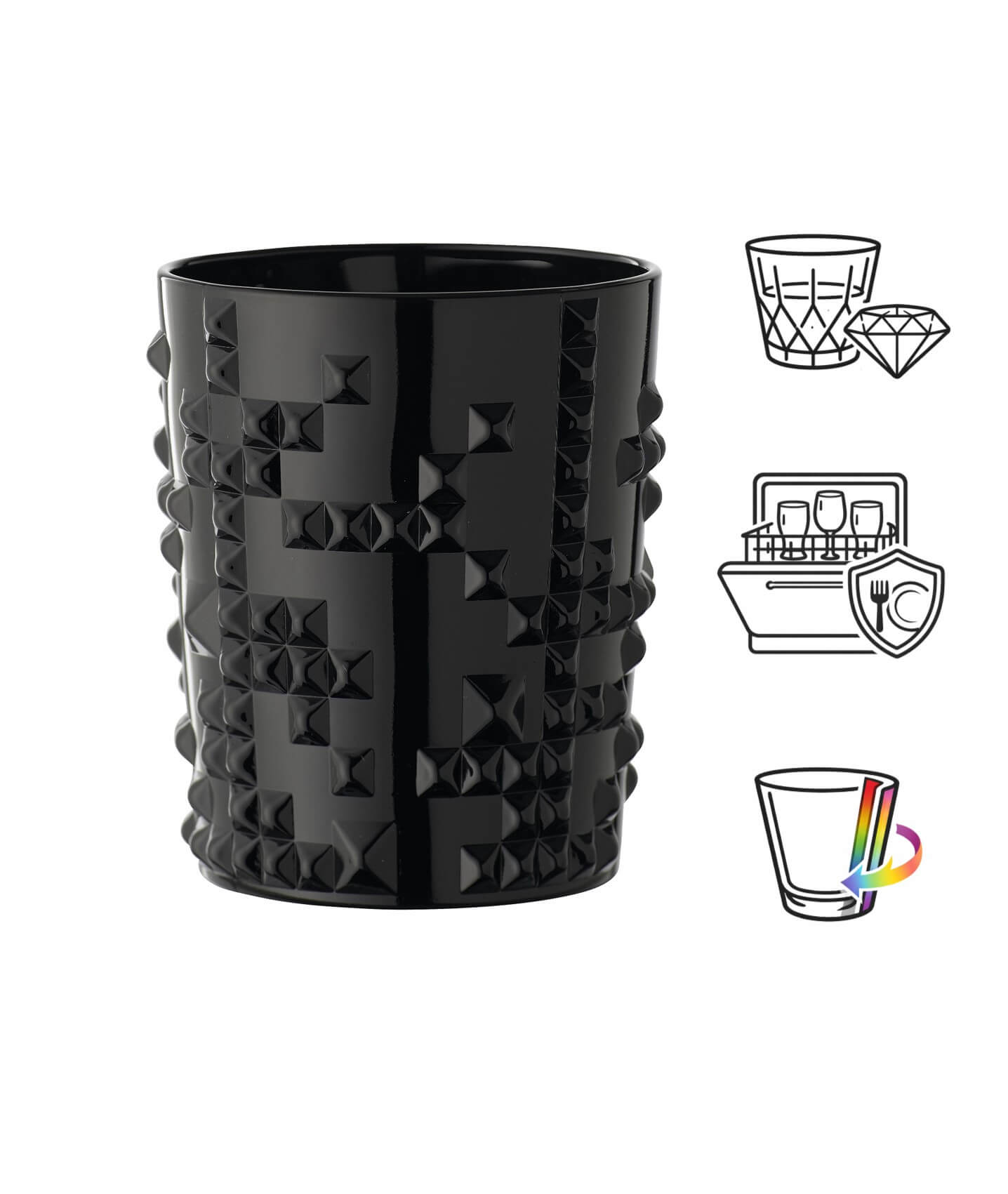 The PUNK series by Nachtmann honors and celebrates punk culture. The glasses are covered with a pattern of rivets and this tumbler is additionally dyed jet black. With this combination, the 348ml whiskey glass looks both noble and rebellious.