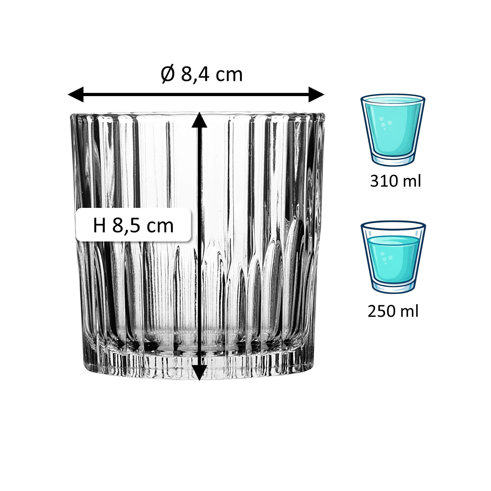 1Note: The specified 'total volume' (also referred to as gross capacity) of a glass indicates the maximum amount of liquid it can hold when filled to the brim. In contrast, the 'fill volume' (also referred to as usable volume or serving volume) describes the practically usable amount. Both values are given in ml or l. Due to production conditions, a tolerance of ±5% may occur, which corresponds to industry standards and does not constitute a defect.