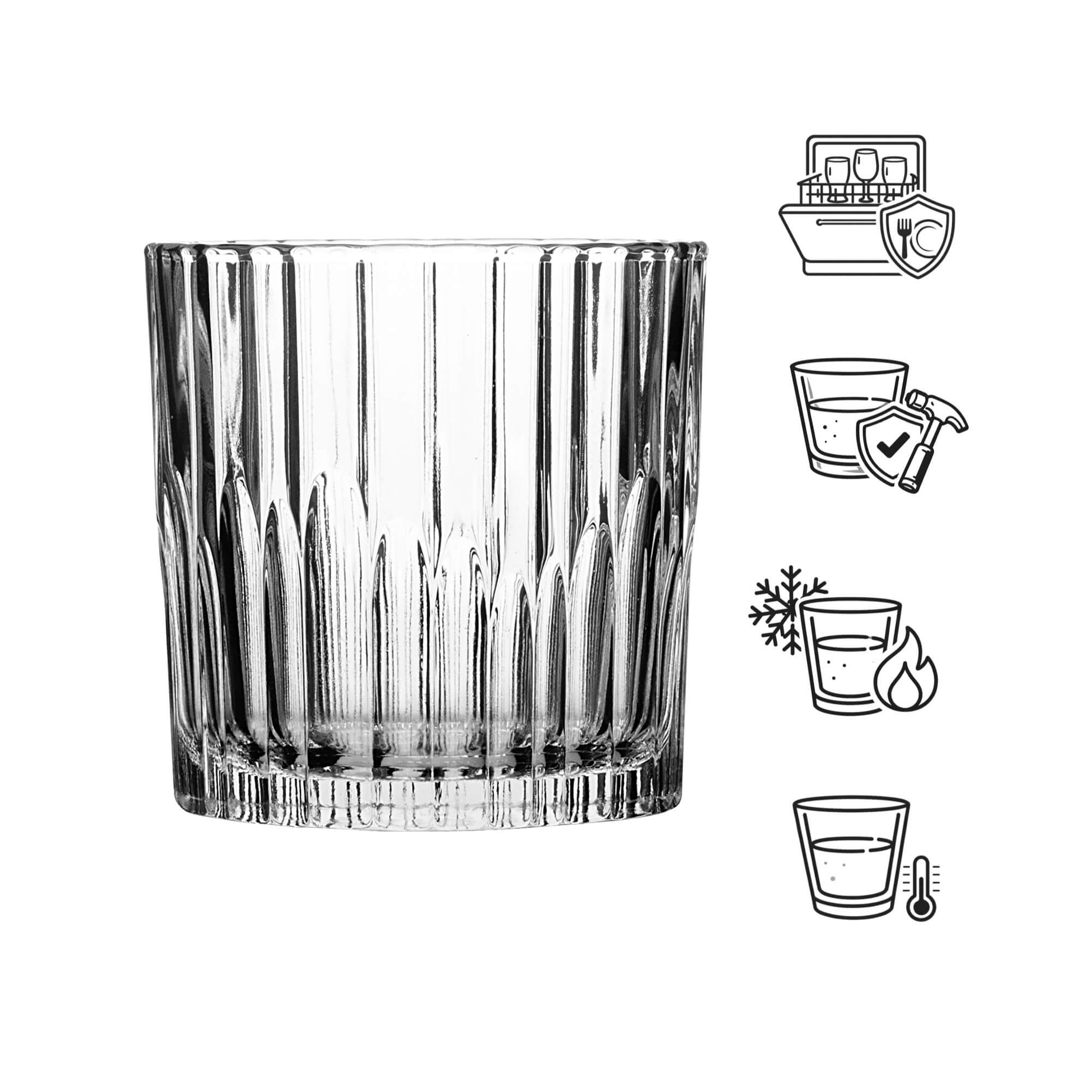 This modern and timeless whiskey tumbler from Duralex has a capacity of 310ml. The tumbler has the linear design of the 'Manhattan' series with a textured surface. The wide diameter is 8,4cm and the height is 8,5cm. Overall, the tumbler is very easy to grip and handle. The whisky tumbler is suitable for both professional and private use.