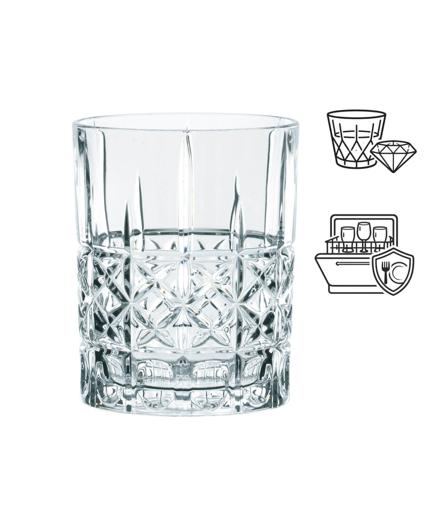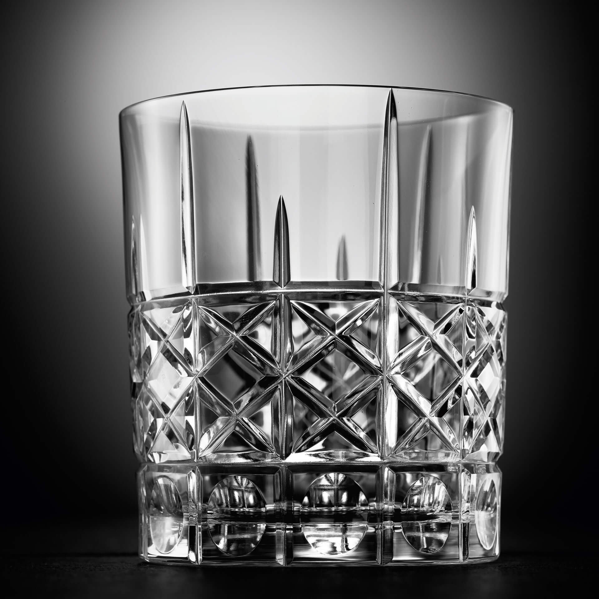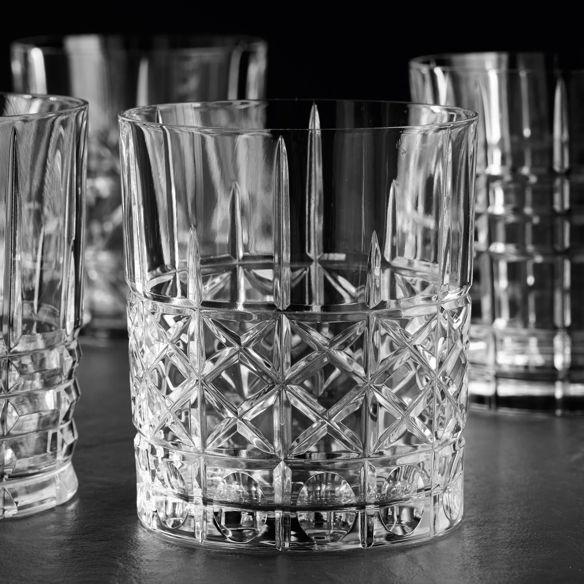The "Diamond" glass with its vertical and horizontal lines is similar to the "Straight", but is also decorated with additional diagonal cuts inside the rectangles at the lower part. Due to this lines, the tumbler has a diamond shaped cut. Finally, the rectangles in the bottom row are equipped with a circular deepening, which provide a very good grip.
