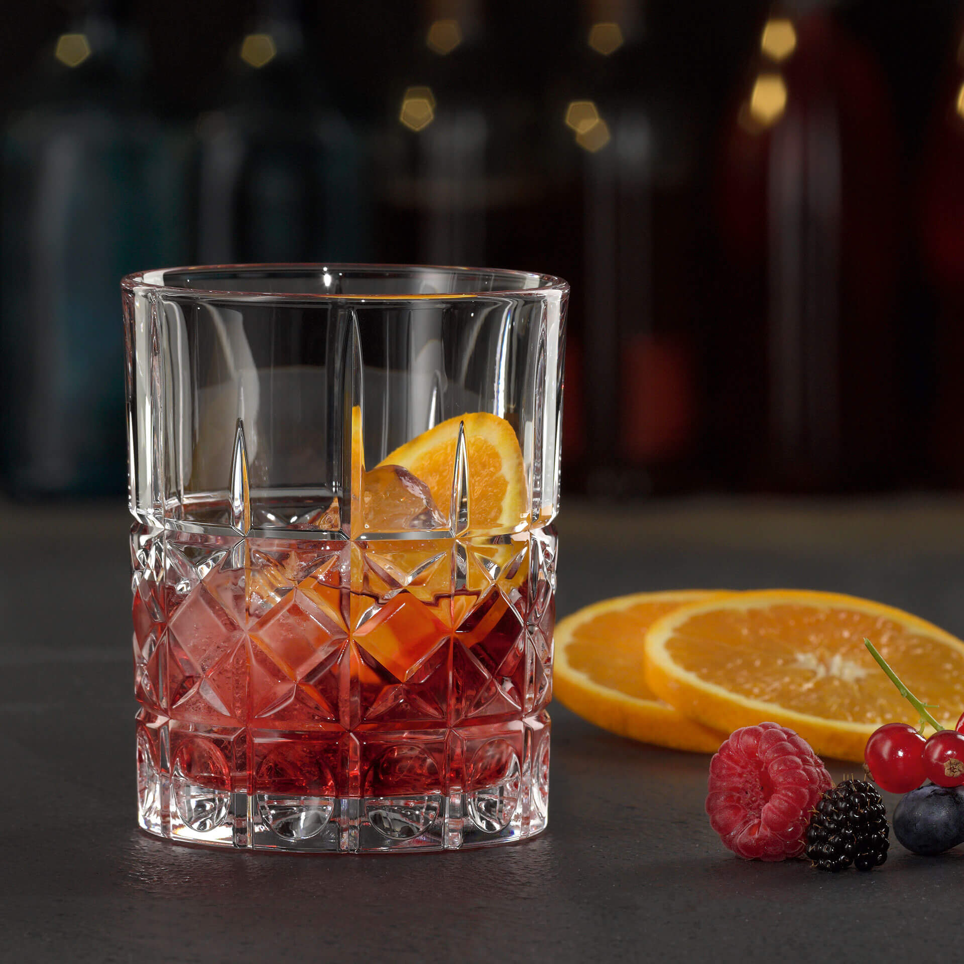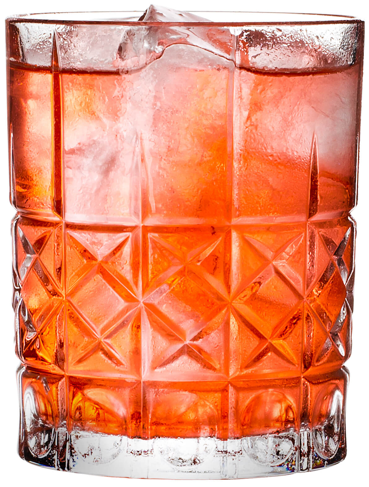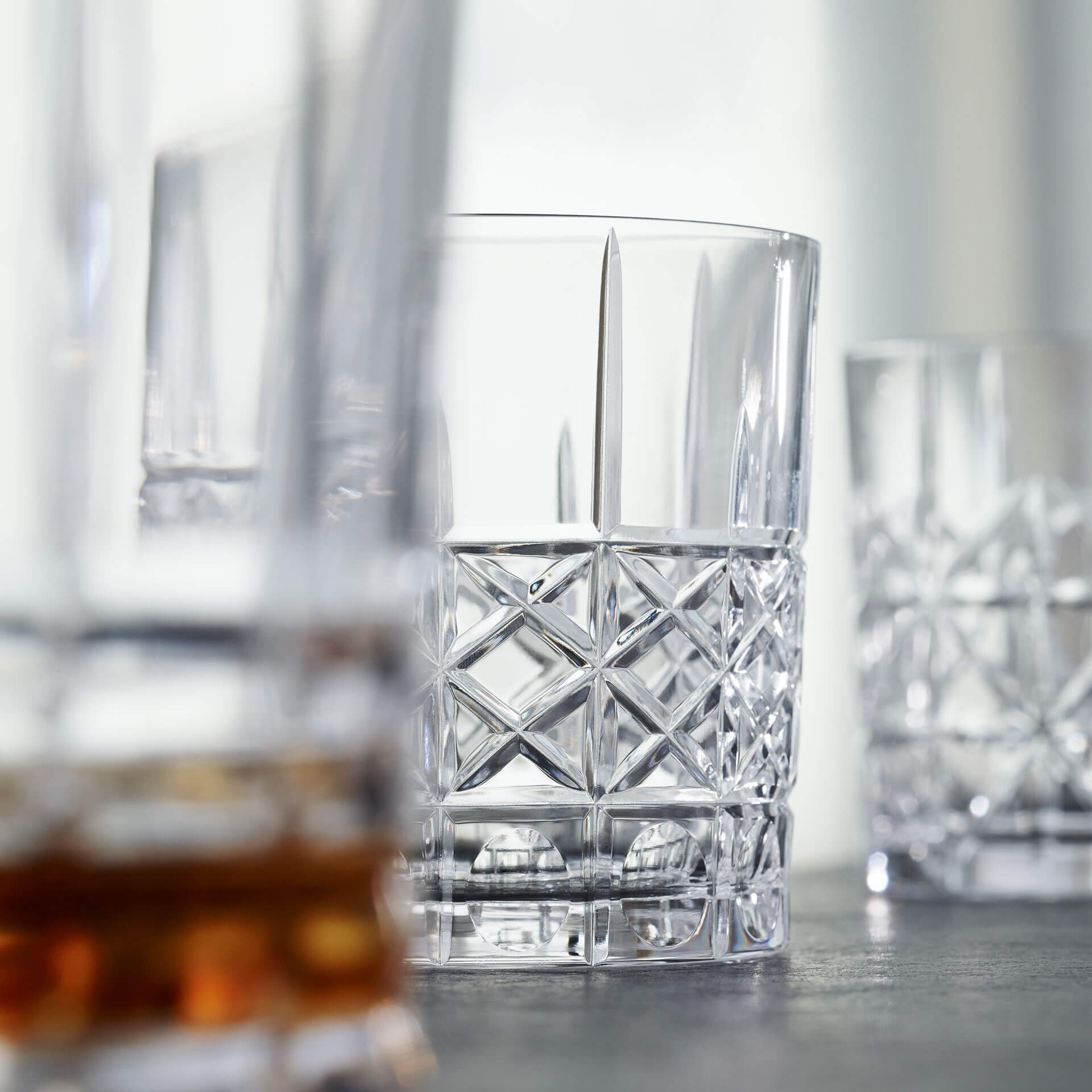 The "Diamond" glass with its vertical and horizontal lines is similar to the "Straight", but is also decorated with additional diagonal cuts inside the rectangles at the lower part. Due to this lines, the tumbler has a diamond shaped cut. Finally, the rectangles in the bottom row are equipped with a circular deepening, which provide a very good grip.