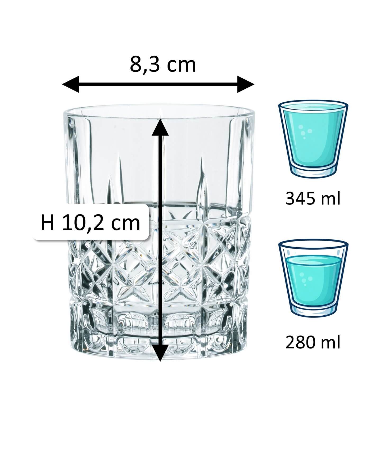 1Note: The specified 'total volume' (also referred to as gross capacity) of a glass indicates the maximum amount of liquid it can hold when filled to the brim. In contrast, the 'fill volume' (also referred to as usable volume or serving volume) describes the practically usable amount. Both values are given in ml or l. Due to production conditions, a tolerance of ±5% may occur, which corresponds to industry standards and does not constitute a defect.