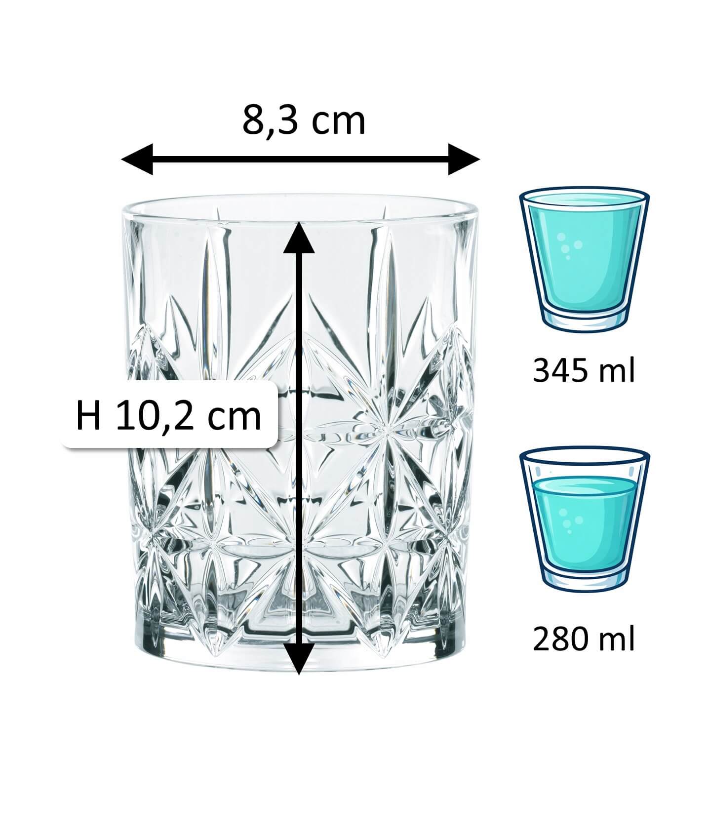 1Note: The specified 'total volume' (also referred to as gross capacity) of a glass indicates the maximum amount of liquid it can hold when filled to the brim. In contrast, the 'fill volume' (also referred to as usable volume or serving volume) describes the practically usable amount. Both values are given in ml or l. Due to production conditions, a tolerance of ±5% may occur, which corresponds to industry standards and does not constitute a defect.