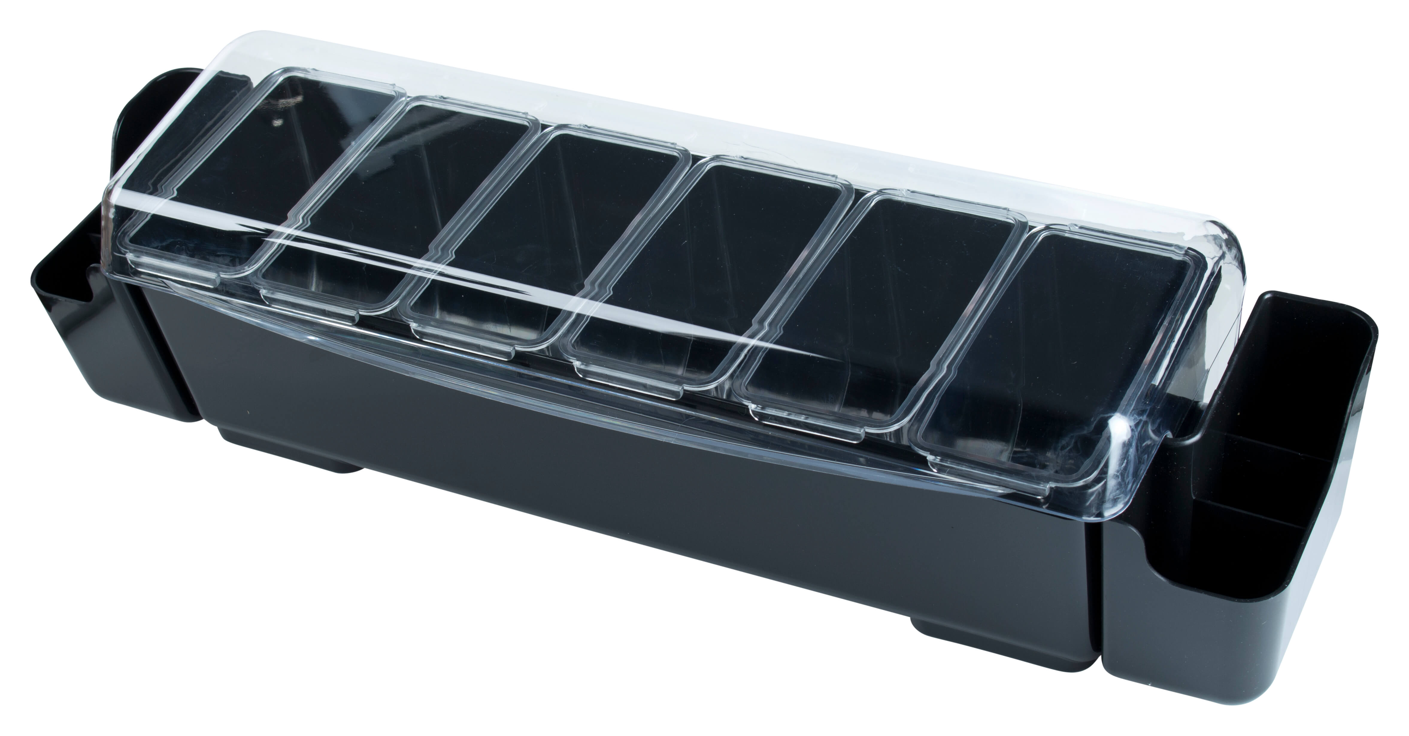 The black condiment holder also has an additional container on each side. These can be used for storing drinking straws, stirrers, spoons alike. These containers are not protected by the lid, and therefore can fit longer objects. These containers are further divided into 3 compartments each.